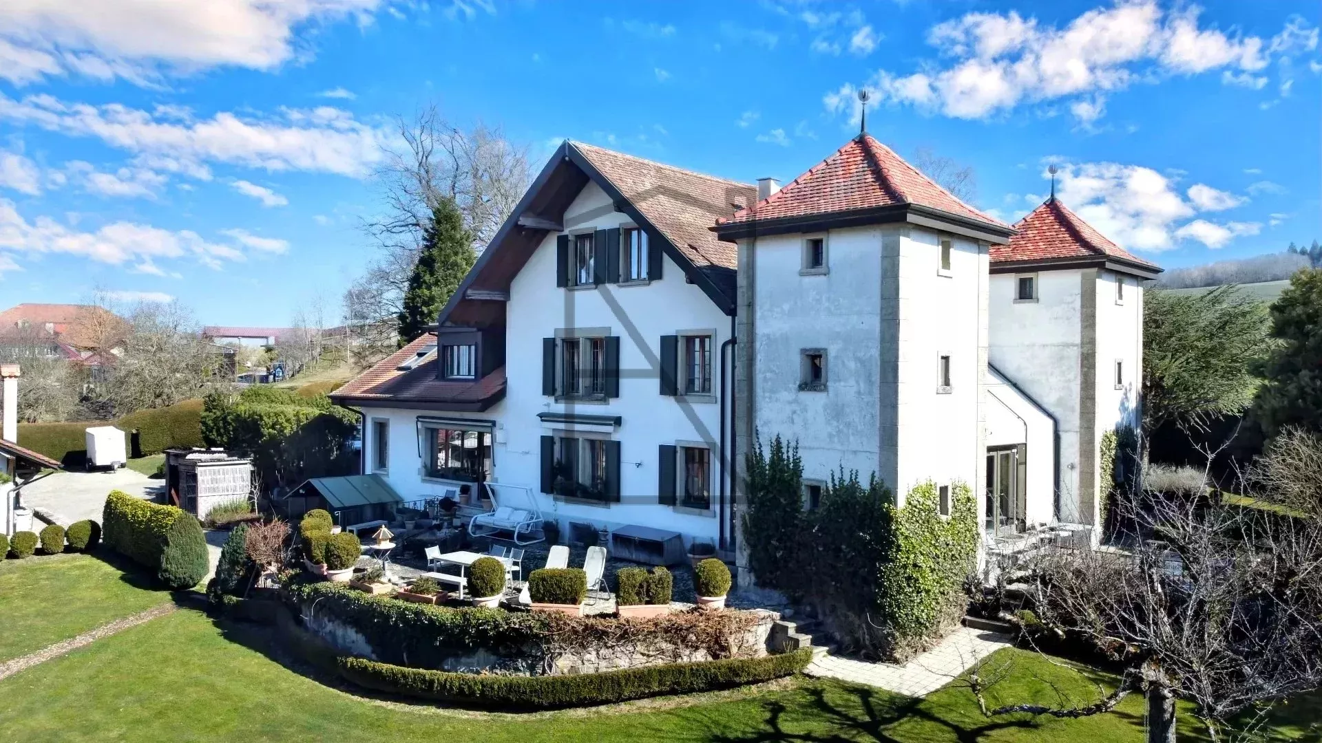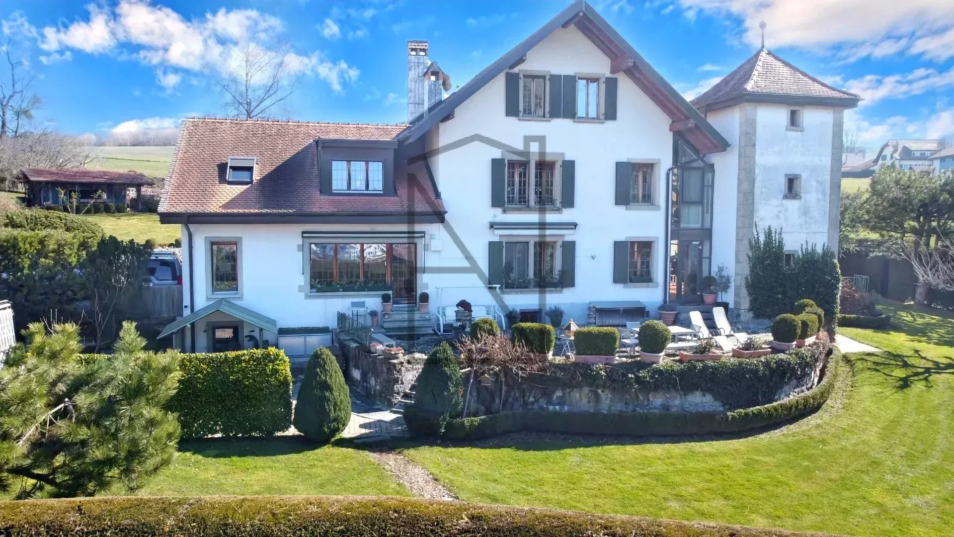Located on the heights of the charming village of St-Cierges, in the Moudon district, this exceptional estate offers a unique living environment combining elegance, comfort and nature. Nestled in over 7,761 m² of private parkland, this exceptional property dominates the surrounding countryside, offering breathtaking views across the Fribourg Pre-Alps to the Jura mountains. With its south and south-west orientation, it benefits from optimum sunshine throughout the day, and rises above the autumnal fog of the Lake Geneva region.