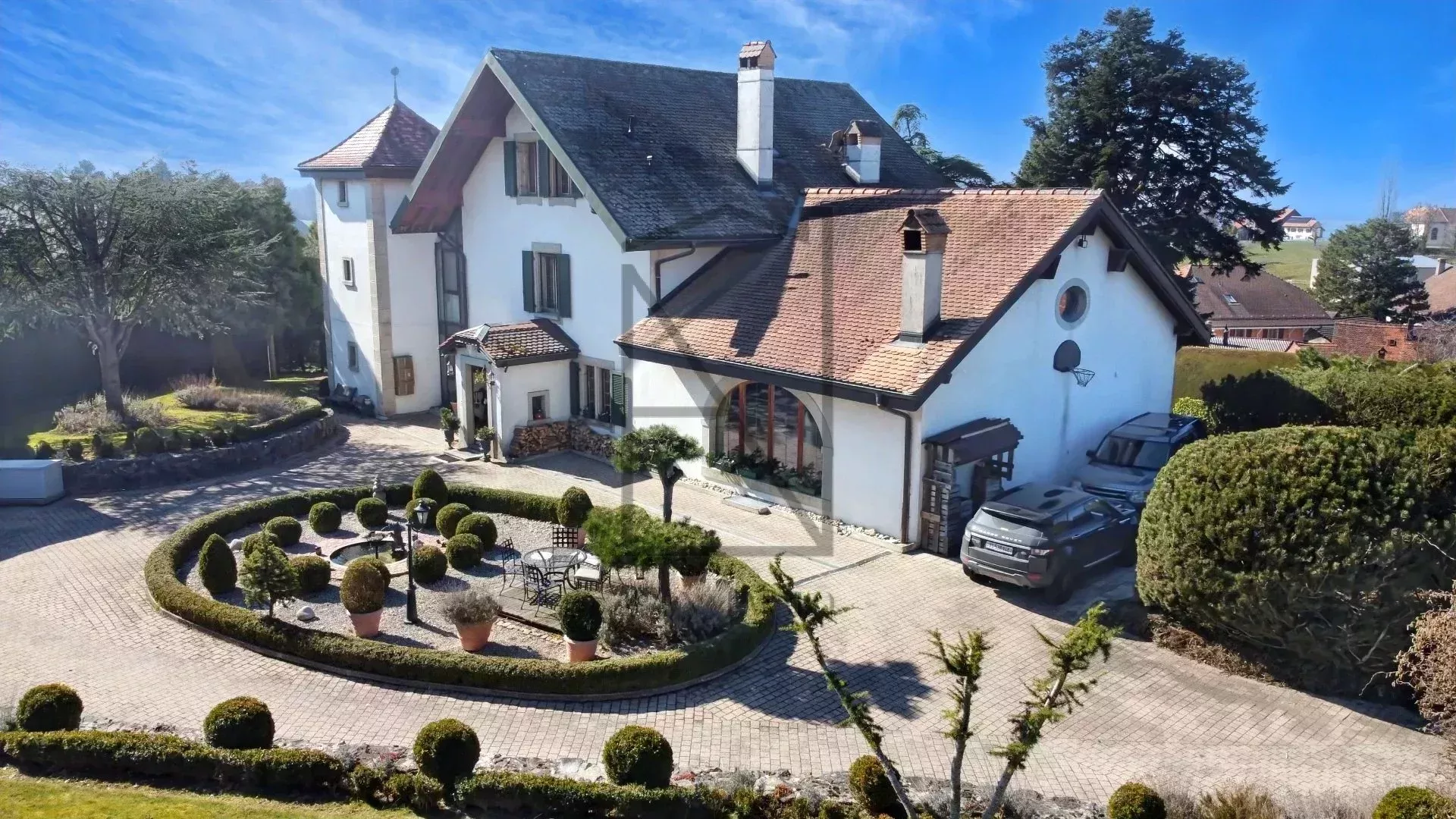 The entire estate is fully enclosed and secured by an electric gate. The grounds are a haven of peace, with century-old trees, a vegetable garden and an orchard with 30 fruit trees. A small private forest, several terraces offering unique views of nature, a summer pavilion and a private path leading to numerous walks across the Jura complete this idyllic setting.