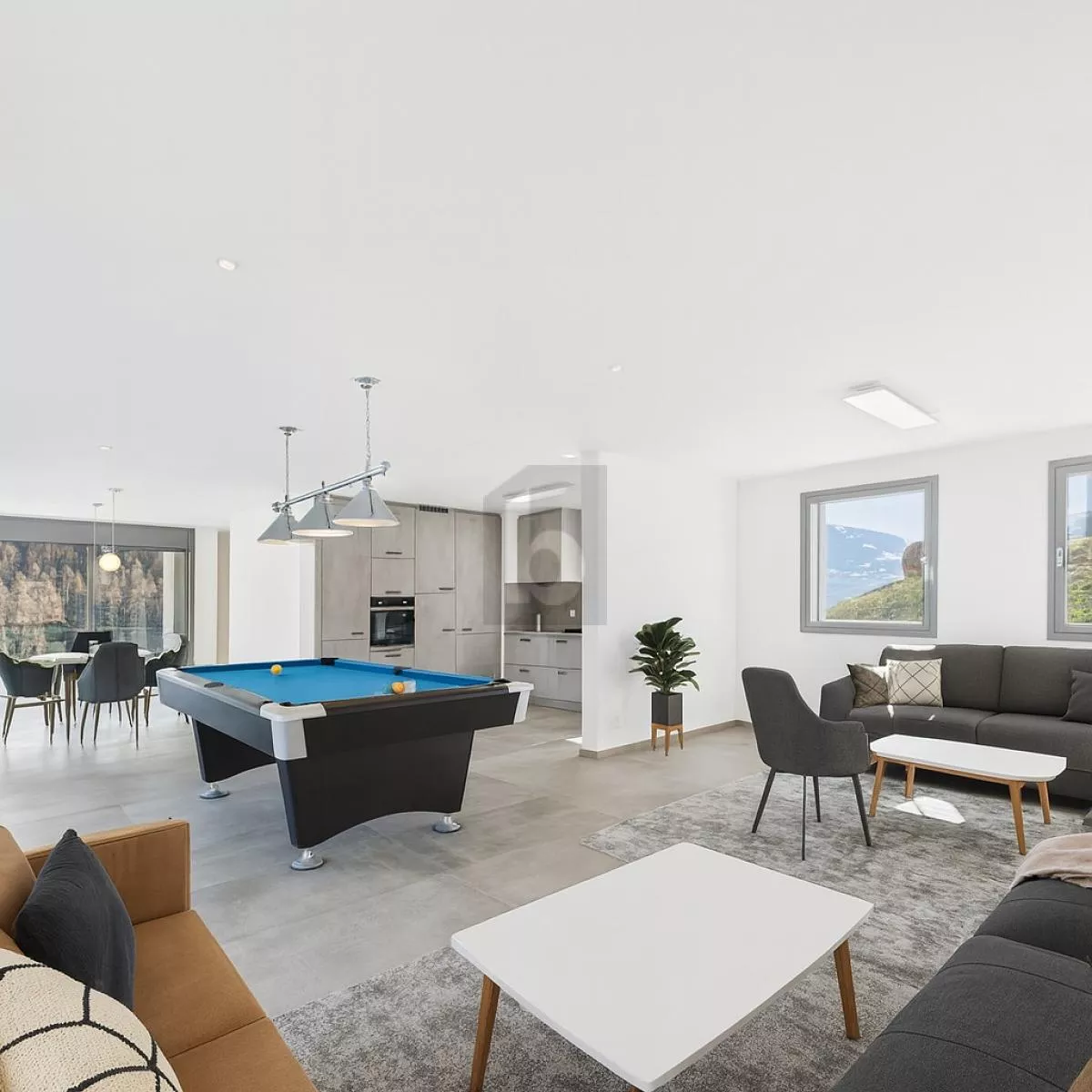 Cette maison individuelle lumineuse à Ayent allie confort et modernité. La partie inférieure offre un parking couvert pour deux voitures, une entrée spacieuse avec une grande cave et un ascenseur. Au premier étage, trois chambres lumineuses, et un espace bureau dont une suite parentale avec dressing et salle de bain luxueuse vous attendent. Une autre salle de bains, une salle polyvalente et un balcon avec une vue de rêve complètent l’étage. L’espace de vie au deuxième étage impressionne avec ses 70 m² et son accès à la terrasse de 37 m². Des panneaux photovoltaïques assurent un chauffage et un refroidissement durables. La maison est située au calme dans une impasse.