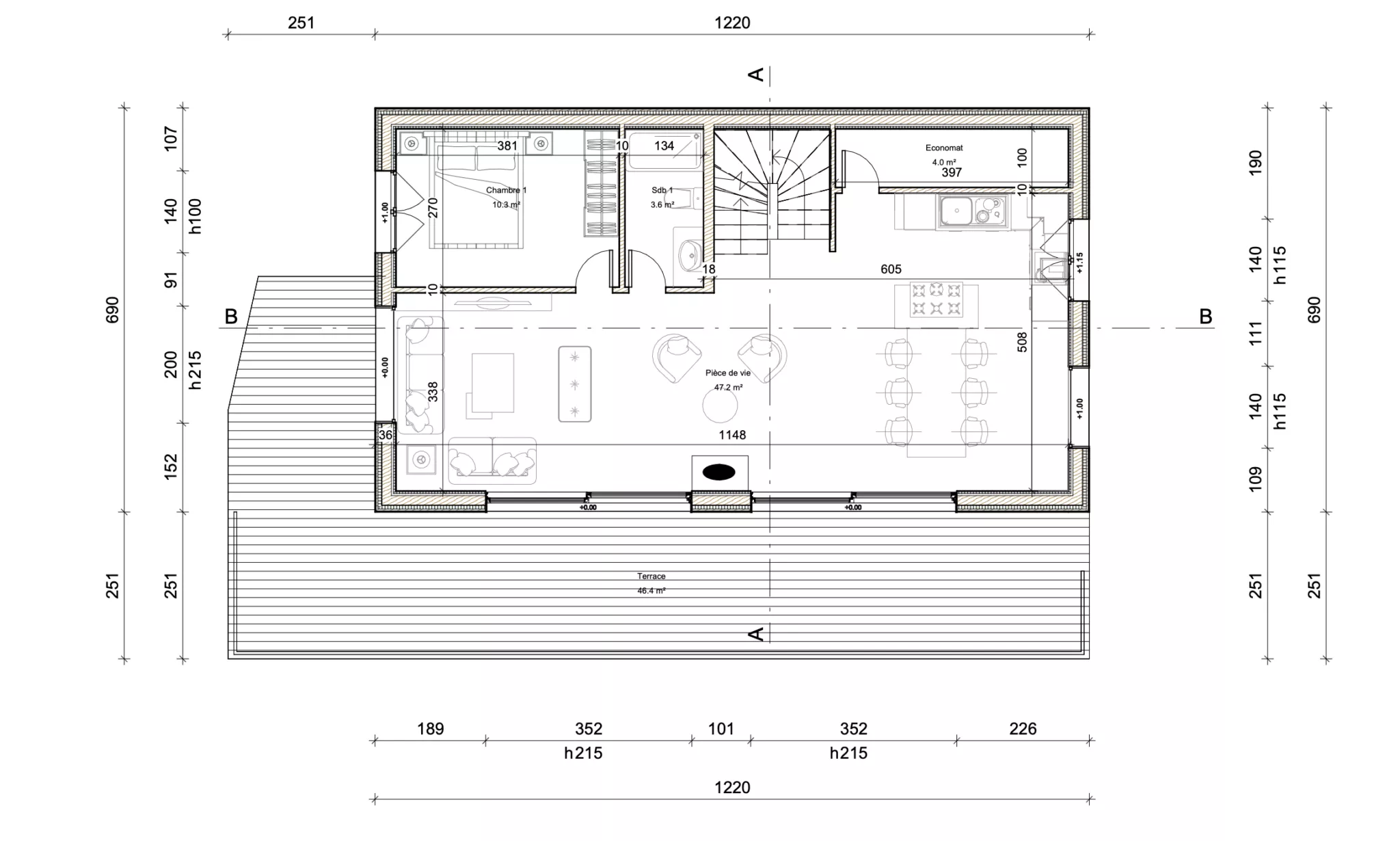 – une pièce de vie spacieuse de 47 m² avec une cuisine ouverte.