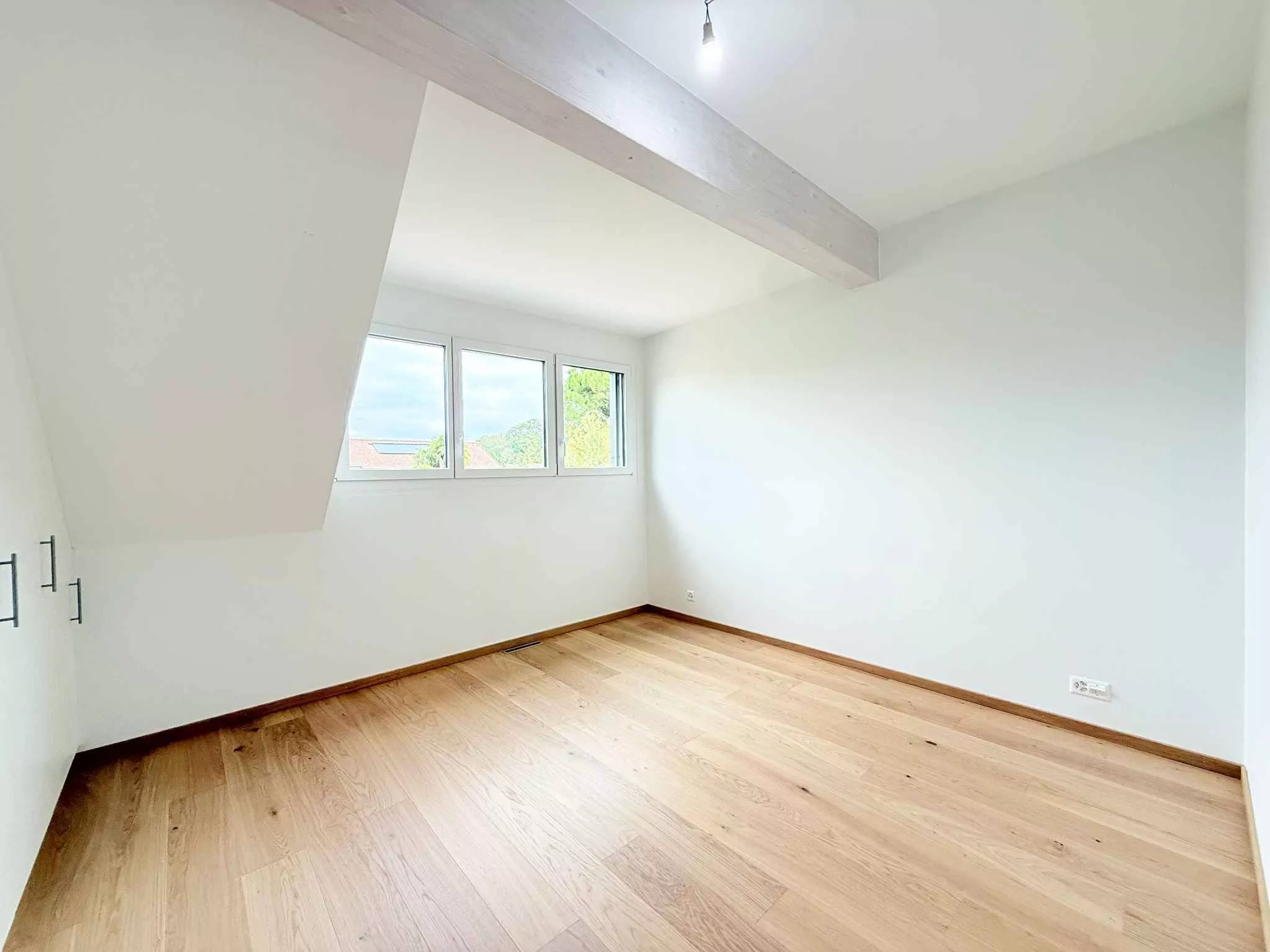 À l’étage, l’espace nuit accueille trois chambres aux proportions généreuses, dont une suite parentale remarquable. Celle-ci offre une salle de bains complète avec baignoire, douche à l’italienne et double vasque, un dressing sur mesure et une atmosphère intime, presque feutrée, propice au repos. Les salles d’eau, habillées de matériaux nobles, prolongent cette exigence de qualité et de durabilité.