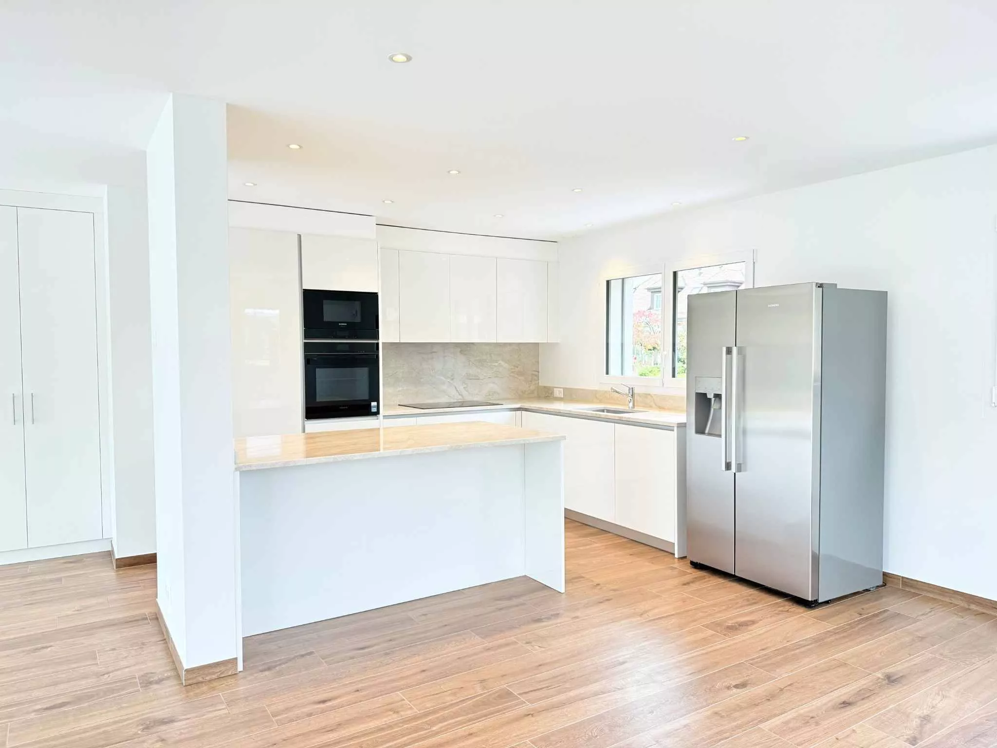 Dès l’entrée, la maison affirme ses volumes. Le hall s’ouvre naturellement sur un vaste séjour baigné de lumière, sublimé par de larges baies vitrées pleine hauteur qui prolongent l’espace vers le jardin. La cuisine ouverte, véritable pièce de vie, séduit par son électroménager haut de gamme et son îlot central en pierre naturelle, pensé pour les moments de partage comme pour l’élégance du quotidien. Chaque détail a été soigneusement étudié : rangements intégrés, variateurs d’éclairage, volets électriques et finitions d’une grande précision dessinent un intérieur à la fois épuré et fonctionnel.